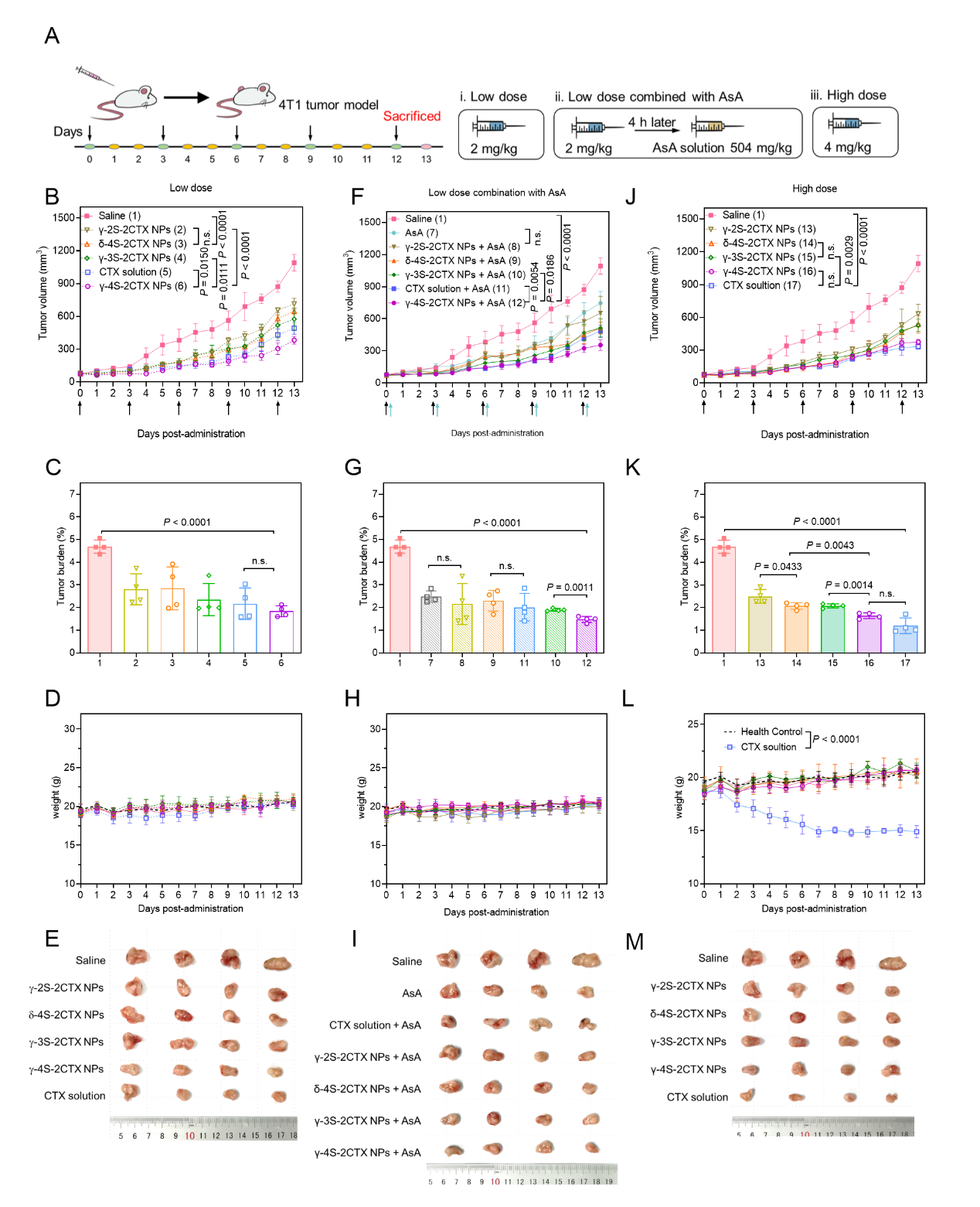 在这项研究中(图1,作者设计了一系列四硫键桥连卡巴他赛(CTX)二聚体前药,系统地考察了四硫键的化学位置对于DPNAs的影响。在综合化学稳定性和激活选择性等因素后,选择了最具潜力的γ-4S-2CTX,并设计了相应二硫键/三硫键桥连前药作为对照。与三硫键和二硫键相比,四硫键赋予DPNAs更强的自组装能力,保证了DPNAs在体内的稳定性。值得注意的是,四硫键具有超高还原反应性,使DPNAs成为高选择性的“肿瘤炸弹”,可以被肿瘤部位的高水平GSH选择性引爆,释放毒性CTX杀伤肿瘤细胞。此外,该团队还提出了一种火上浇油的策略,通过补充外源还原剂来进一步加强肿瘤部位的还原应激,加速γ-4S-2CTX NPs的活化,从而获得更好的抗肿瘤效果,并同时提高了其肿瘤选择性。