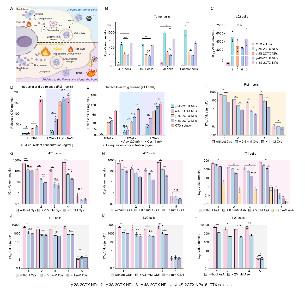 γ-4S-2CTXγ-四硫键连接保证了其体内稳定性和安全性。同时,超高还原反应性的四硫键使γ-4S-2CTX NPs可以被肿瘤中的内源性GSH选择性地“引爆”,杀伤肿瘤细胞。为了充分发挥DPNAs的潜力,向肿瘤部位补充外源性还原剂,如同"火上浇油",进一步引发γ-4S-2CTX NPs的活化,从而获得更好的抗肿瘤效果。