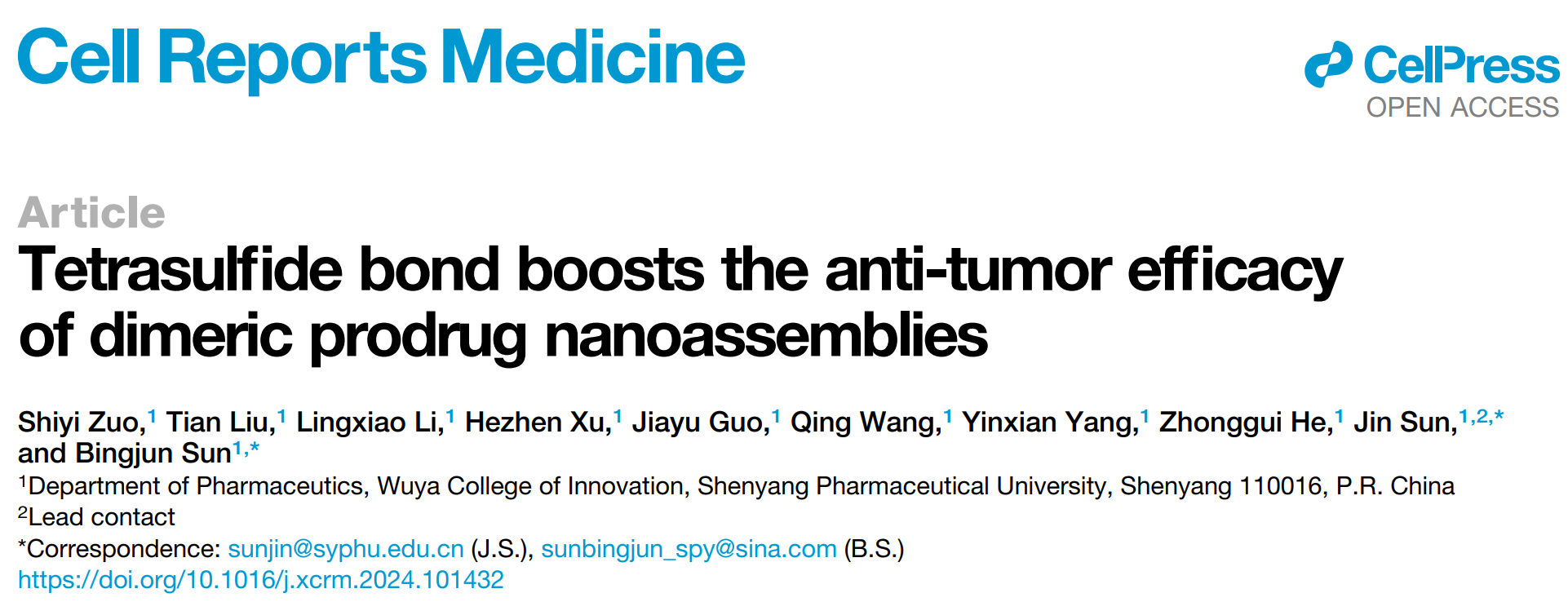 2024221bb贝博艾弗森官方网站孙进/孙丙军团队在Cell旗下子刊《Cell Reports Medicine》(IF=14.3)发表题为“Tetrasulfide bond boosts the anti-tumor efficacy of dimeric prodrug nanoassemblies”的研究文章进一步探讨四硫键在构建前药自组装纳米递送系统中的应用BB贝博艾弗森官网孙进教授和孙丙军教授为此文通讯作者,2021级博士生左诗意为第一作者,bb贝博艾弗森官方网站为唯一通讯单位。