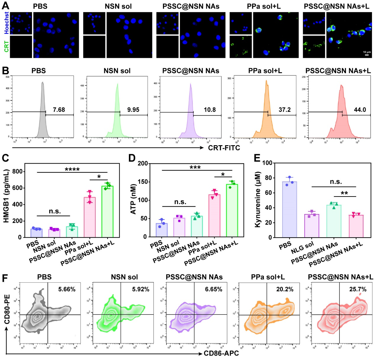 由于超分子纳米组装体具有高效的细胞摄取效率与胞内ROS产生能力,而PDT产生的ROS不仅仅可以直接杀伤细胞,还可通过触发包括CRT、HMGB1和ATP在内的DAMPs的产生,有效诱导肿瘤细胞的ICD,从而诱发抗肿瘤免疫反应。图6实验结果表明超分子纳米组装体显示出强效的ICD诱导效果,显著促进了DCs成熟。
