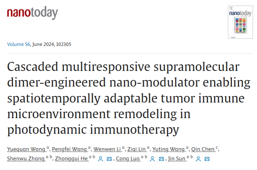 2024年5月6日,bb贝博艾弗森官方网站何仲贵/孙进/罗聪团队在爱思唯尔旗下期刊《Nano Today》(IF=17.4)发表题为“Cascaded multiresponsive supramolecular dimer-engineered nano-modulator enabling spatiotemporally adaptable tumor immune microenvironment remodeling in photodynamic immunotherapy”研究型论文,公司BB贝博艾弗森官网孙进教授、罗聪教授和何仲贵教授为本文通讯作者,2021级博士生王悦全为本文第一作者,bb贝博艾弗森官方网站为第一通讯单位。
