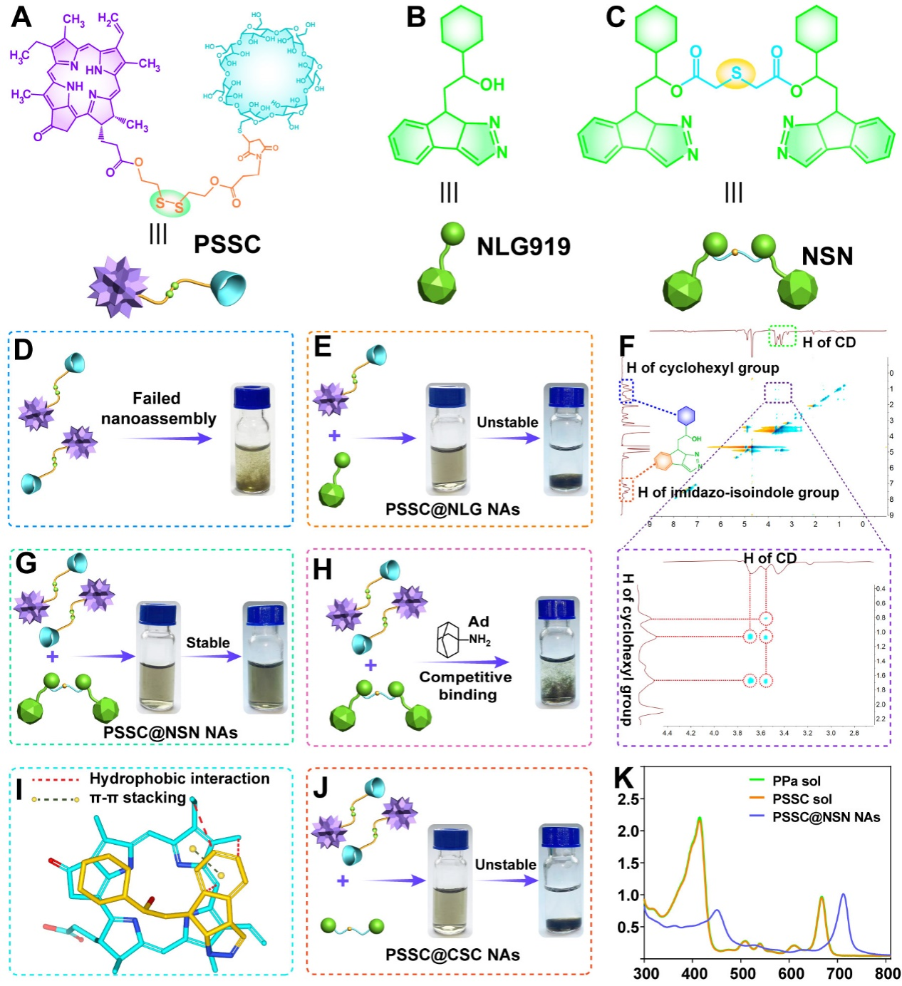 在这项研究中(图1),作者首次发现了一种“超二聚体”驱动的新型纳米组装模式并构建了一种具有时空自适应级联释药特性的超分子纳米组装体,用于高效共递送光敏剂PPa与IDO抑制剂NLG919,并进一步与PD-L1抗体进行联用,以激活免疫反应并同时逆转免疫抑制微环境,从而增强肿瘤的光动-免疫治疗效果。合成了单硫键桥连的IDO抑制剂NLG919同源二聚体前药(NLG-S-NLG, NSN)与二硫键桥连的环糊精(CD)-PPa偶联物(PPa-SS-CD, PSSC),首次发现了两分子PSSC与一分子NSN可以形成一种“超二聚体”结构,具有良好的纳米组装特性,基于此构建了一种新型的超分子纳米组装体(PSSC@NSN NAs)。值得注意的是,CD的引入不仅可以通过主-客体包合作用精确地驱动超分子纳米组装,而且还可以在没有PEG聚合物修饰的情况下赋予纳米组装亲水性表面,实现稳定组装与递送。在肿瘤细胞中高GSH存在时,PSSC中的二硫键作为触发纳米组装解体的“一级开关”,有效缓解PPa的聚集诱导淬灭(ACQ)效应并促进1O2的产生和ICD的诱导效果。PPa产生的1O2和肿瘤细胞中高内源性ROS协同开启NSN中的单硫键“二级开关”,促进NLG919的快速释放。因此,超分子纳米组装体通过“两级开关”的引入可以级联实现ACQ缓解、ICD诱导、NLG919释放和IDO抑制,在两种荷瘤小鼠模型中均表现出良好的抗肿瘤效果,并与PD-L1抗体联合展现出协同治疗作用。