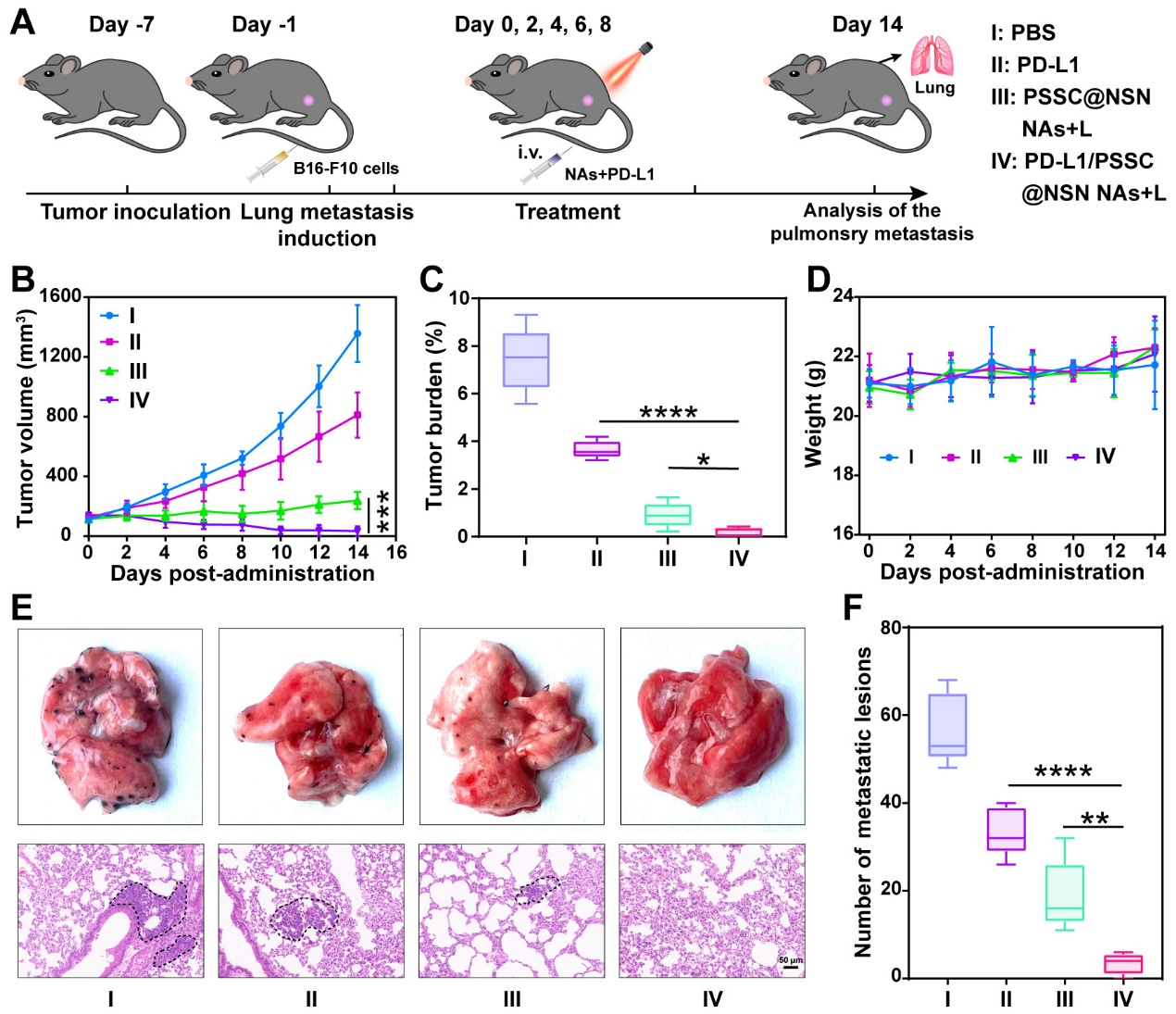 鉴于在体内诱发的强大免疫反应,作者进一步评估超分子纳米组装体诱导全身免疫反应抑制远端肿瘤的潜力,结果显示在双侧皮下CT26荷瘤小鼠模型中对原发肿瘤和远端肿瘤都显示出强大的抑制作用,并具有良好的安全性(图7)。由于在诱导ICD和逆转免疫抑制微环境方面令人鼓舞的结果,作者猜想这种超分子纳米组装体可能会增敏PD-1/PD-L1抗体介导的免疫检查点阻断疗法并建立了肺转移性B16-F10肿瘤模型。结果显示在近红外光的照射下,超分子纳米组装体联合PD-L1抗体在肿瘤生长抑制和肺转移方面明显优于单一治疗组,这种联合闭环治疗模式,显著增强了肿瘤免疫治疗效果和抑制了肿瘤肺转移(图8)。