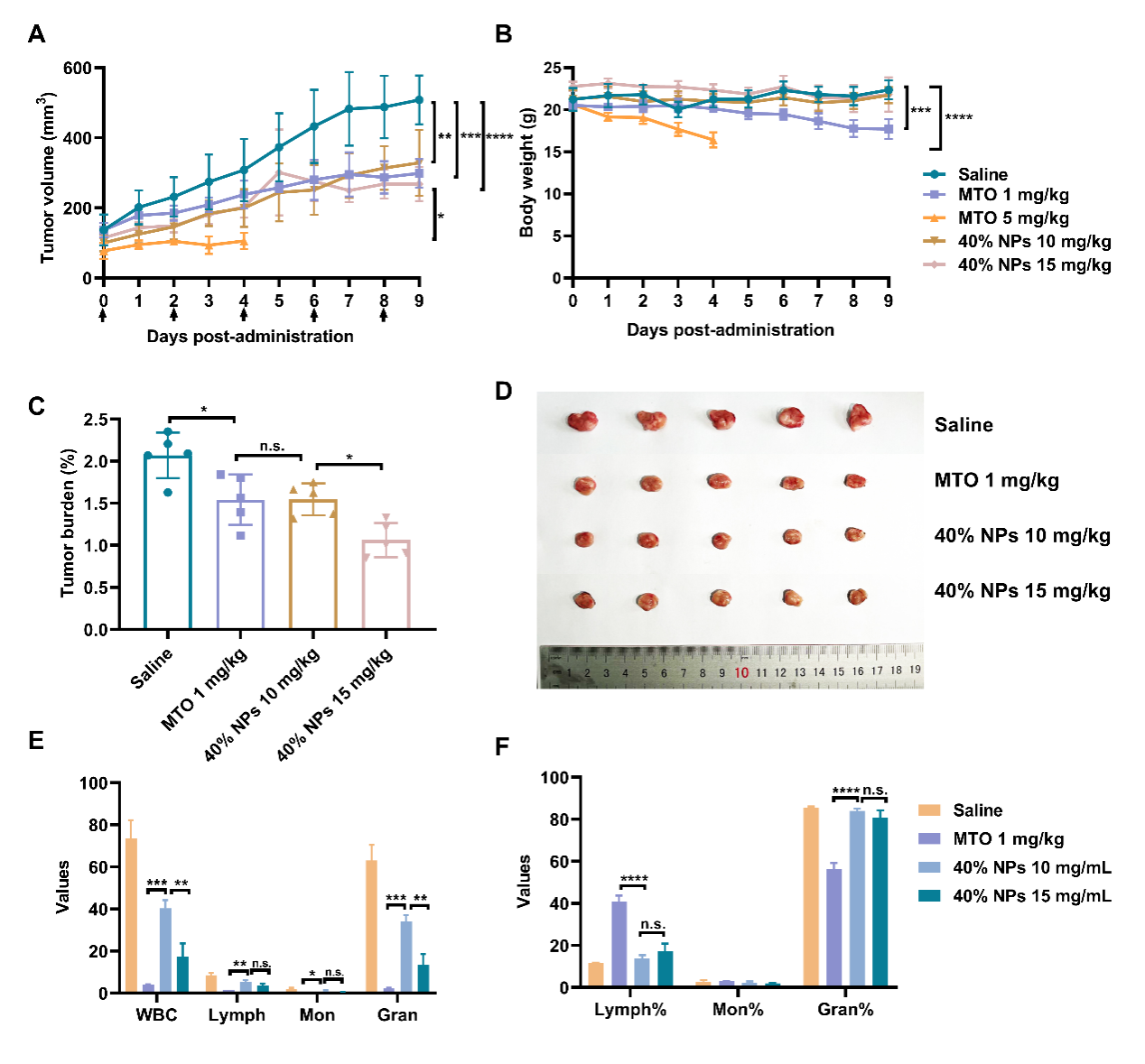 体内抗肿瘤效果和血常规分析显示(图5),米托蒽醌溶液剂的耐受剂量较低,且存在着严重的毒性。而与米托蒽醌溶液剂相比,40% NPs显著提高了耐受剂量,在保证了治疗效果的同时,提升了米托蒽醌的安全性。