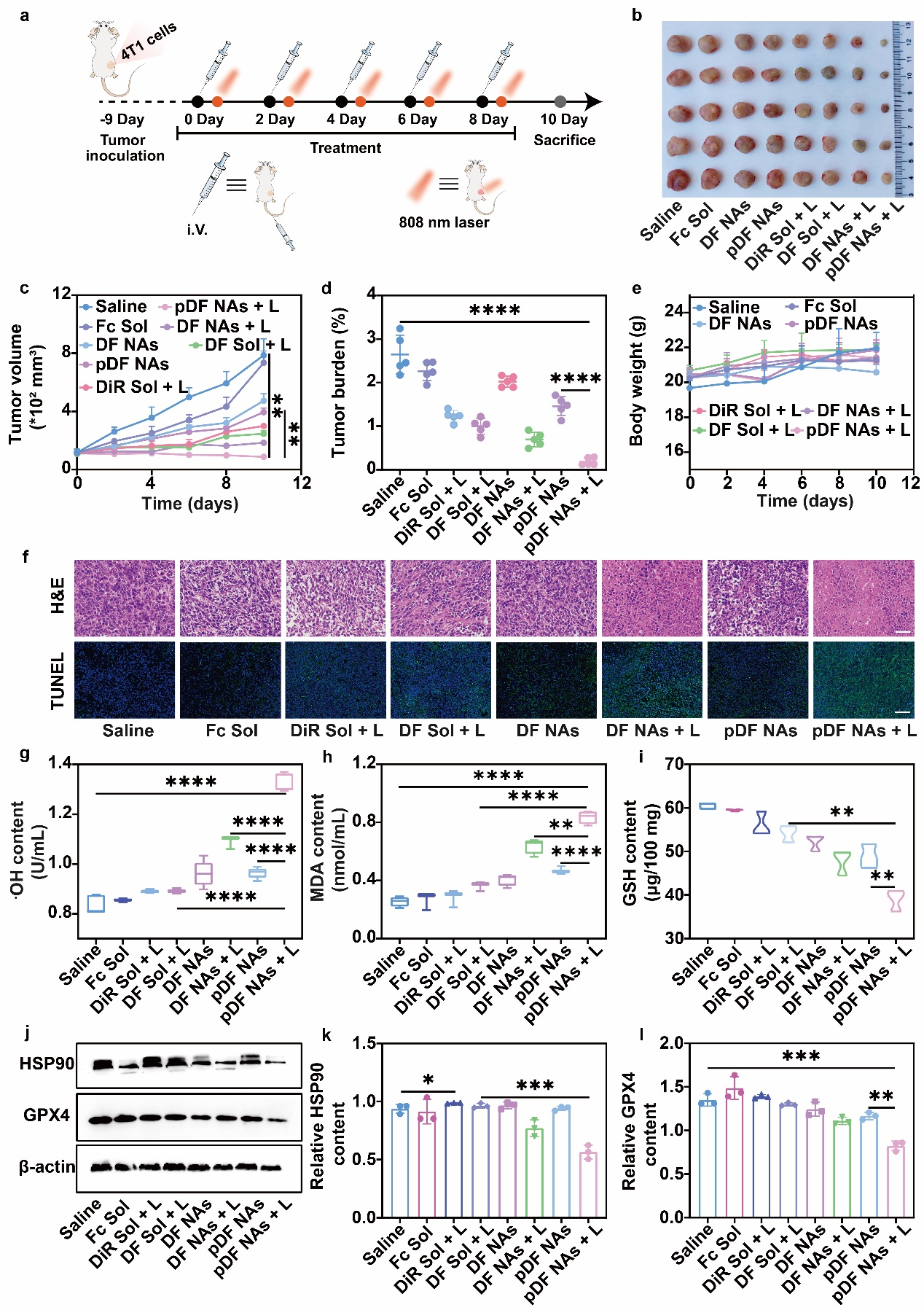 最后,作者对4T1乳腺癌荷瘤小鼠进行了不同组别的制剂处理,包括Saline、Fc Sol、DiR Sol + L、DF Sol + L、DF NAs、DF NAs + L、pDF NAs和pDF NAs + L。实验结果表明,在808 nm近红外光照射下,pDF NAs具有最强的抗肿瘤效果,并且体内协同机制实验也进一步表明pDF NAs在给予808 nm近红光照射后具有较好的氧化损伤相关因子的诱导及HSP90抑制效果。此外,研究者们进行了体内安全性的初步评价,发现纳米组装体具有良好的体内安全性,小鼠体重与主要的组织器官均未观察到明显异常。综合来看,研究者们构建的pDF NAs在808 nm近红外光照射下具有较为良好的PTT/铁死亡协同肿瘤抑制效果(图6)。