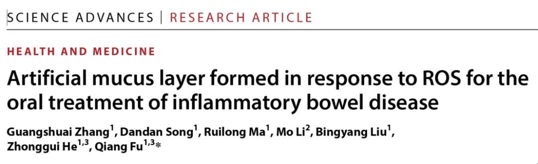 近日,Science子刊Science AdvancesIF=11.7)在线发表了BB贝博艾弗森官网何仲贵教授和付强教授课题组在ROS响应性人工黏液研究领域取得的最新研究成果,论文题目为“Artificial mucus layer formed in response to ROS for oral treatment of inflammatory bowel disease”。