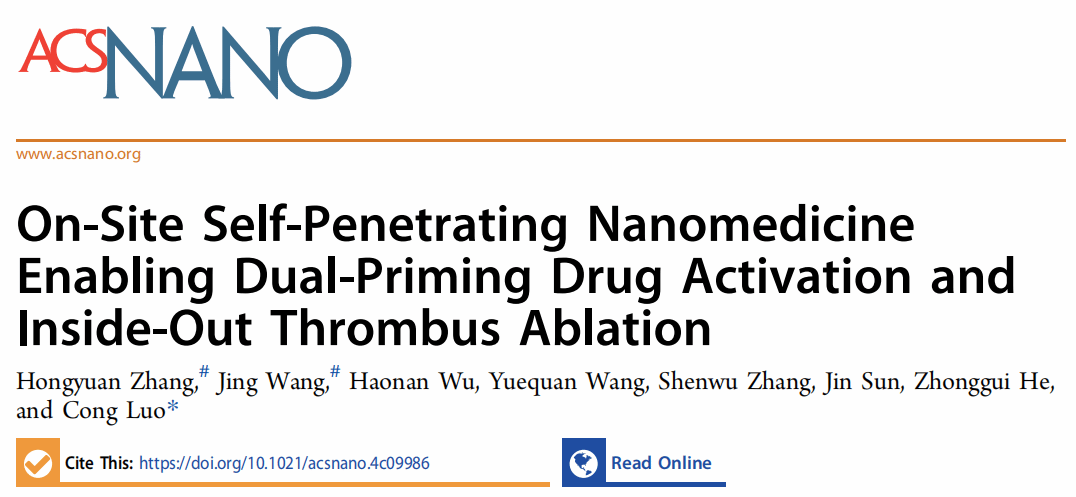 近日,BB贝博艾弗森官网罗聪教授团队在《ACS Nano》(IF=15.8)在线发表了最新研究成果“On-Site Self-Penetrating Nanomedicine Enabling Dual-Priming Drug Activation and Inside-Out Thrombus Ablation”。该研究提出了一种基于光热/光动双效光敏剂与氧化响应抗血小板前药共组装实现多模式激活抗血栓前药的新策略,有望解决血栓ROS异质性导致的前药激活瓶颈难题。在该研究中,作者首先设计合成了一种抗血小板药物替格瑞洛(TGL)的氧化响应前药(TGL-S-Fmoc, TSF)。随后,发现TSF可以与光热/光动双功能的光敏剂IR808共组装形成稳定的纳米结构。基于此,作者开发了一种自穿透、自激活、多模式协同的无载体纳米组装递药系统(T-TSFI NAs)。在光热效应的辅助下,T-TSFI NAs不仅能够实现血栓的深部穿透,还通过产生ROS协同内源性ROS触发前药按需激活,栓块内部释放抗血小板药物TGL,从而实现光热/抗血小板协同溶栓。T-TSFI NAs在FeCl₃诱导的大鼠颈动脉血栓模型中不仅有效抑制了血小板的激活和聚集,还显著降低了出血风险。这一策略成功克服了血栓微环境中ROS分布不均的难题,为抗血栓前药按需高效激活提供了新思路。